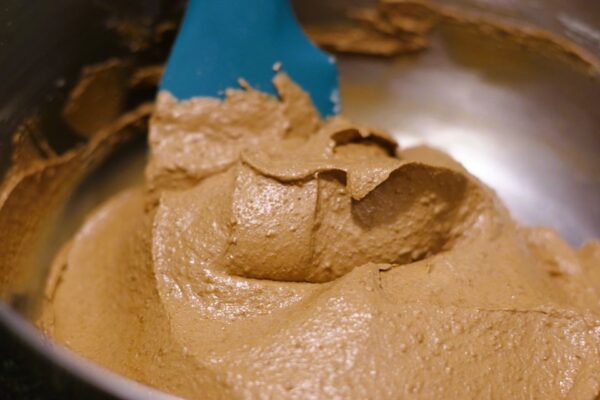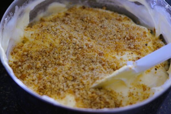 7. Add ground walnut mixture in two parts and gently fold in by using a silicone spatula.