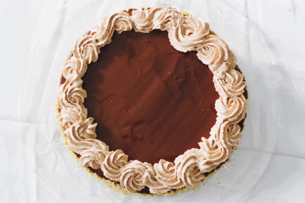6. Pour chocolate ganache on top of the cake, use offset spatula to spread evenly and smooth.