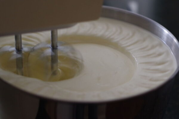 - Use hand held or standing mixer to beat eggs. Start at medium speed and add sugar in increments. Increase mixer speed to high and beat until mixture is thick and forms a slowly dissolving ribbon, approximately 6-10 minutes. Note: Carefully watch the mixture to avoid overmixing! Once the mixture is pale yellow and fluffed up check the ribbon. If you mix too long your mixture will start losing strength and will start shrinking by volume.
