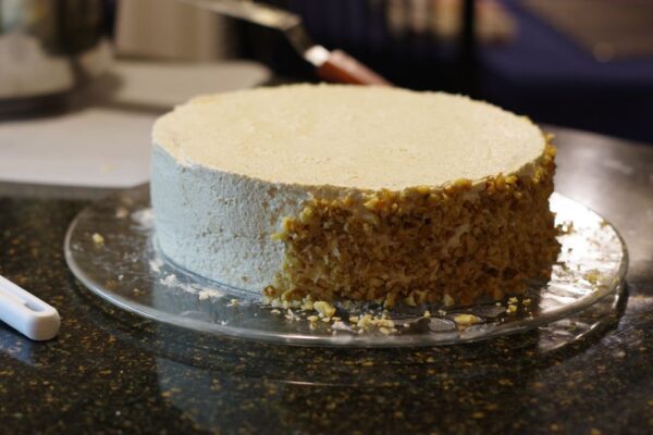 - Use offset metal spatula to press chopped walnuts onto the side of the cake.