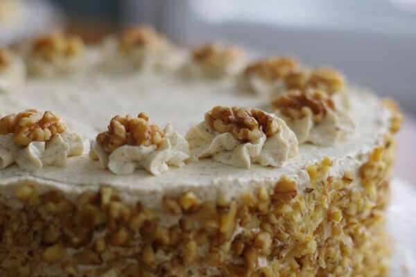 - Pipe twelve rosettes on top of the cake, around cake perimeter, place walnut half on each rosette.