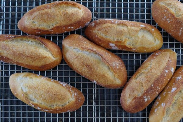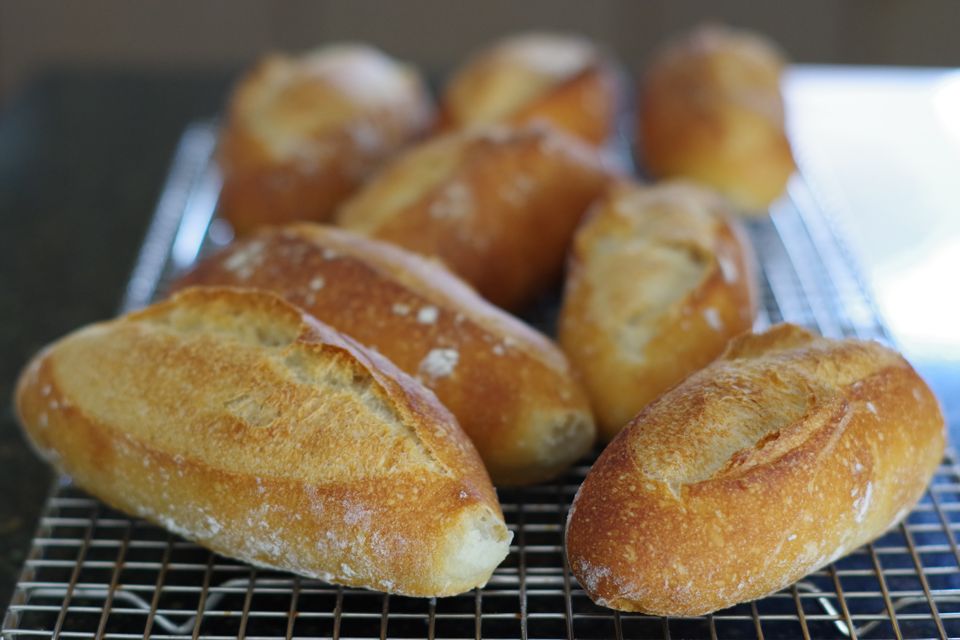 - 10:39 Use razor blade or sharp knife to cut each roll, making one decisive cut along the length of the roll. Use dusted wooden board to transfer all the rolls to the baking stone. Use water bottle to spray inside the oven and create steam. Bake for 20 minutes.